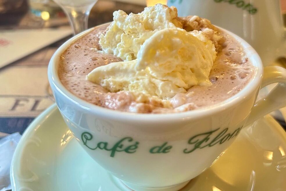 生クリームが添えられた濃厚なホットチョコレートです。濃厚でビターなチョコレートに、ふんわりとしたクリームが絶妙に溶け合う、パリの定番ともいえる贅沢な一杯です。心の底から満たされる幸福感があります。