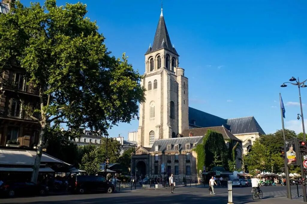 駅の出口を出て、有名なサン=ジェルマン=デ=プレ教会を右手に見ながら、サン=ジェルマン大通り(Boulevard Saint-Germain)を西へ進みます。徒歩わずか1〜2分です。