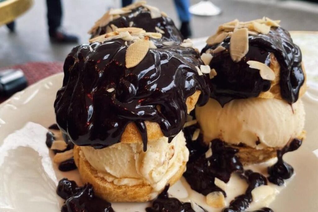 小さなシュー生地の中にバニラアイスを詰め込み、上から温かい濃厚なチョコレートソースをたっぷりかけていただく、贅沢なデザート。シューのサクサクとした食感とアイスの冷たさ、そして温かいチョコソースのコントラストが楽しく、見た目も華やかな一品です。