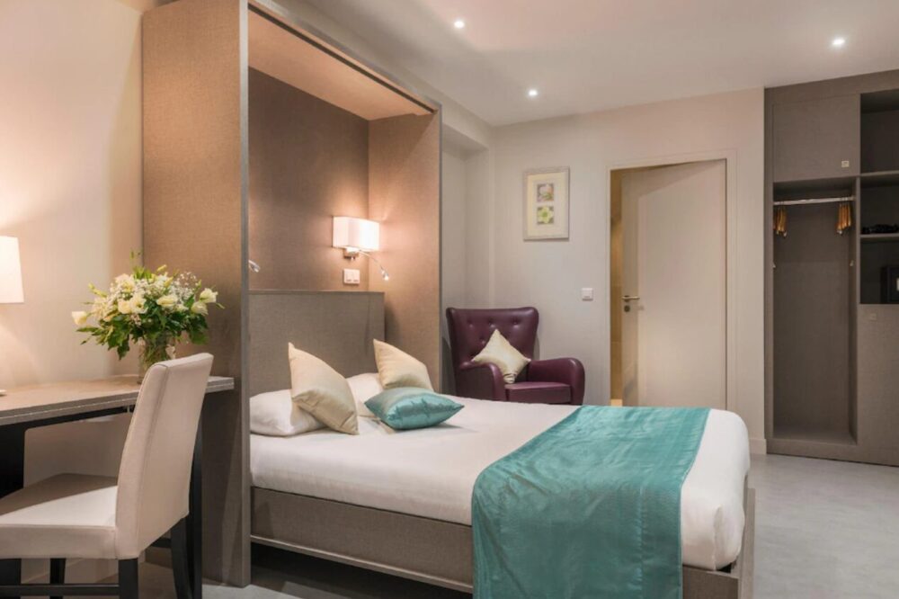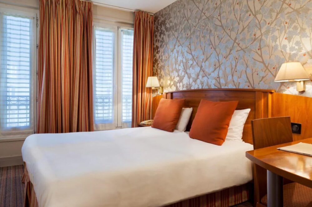 クラシックなパリの建物を利用したホテルで、家庭的な雰囲気と清潔感のある客室が特徴です。