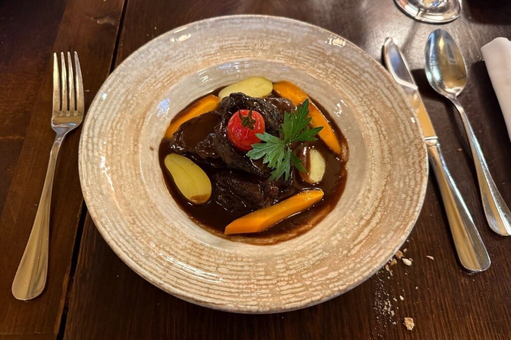 五郎さんも感動した、牛肉の赤ワイン煮込み。長時間煮込まれた牛肉はトロトロで、深いコクがありながらも優しい味わい。