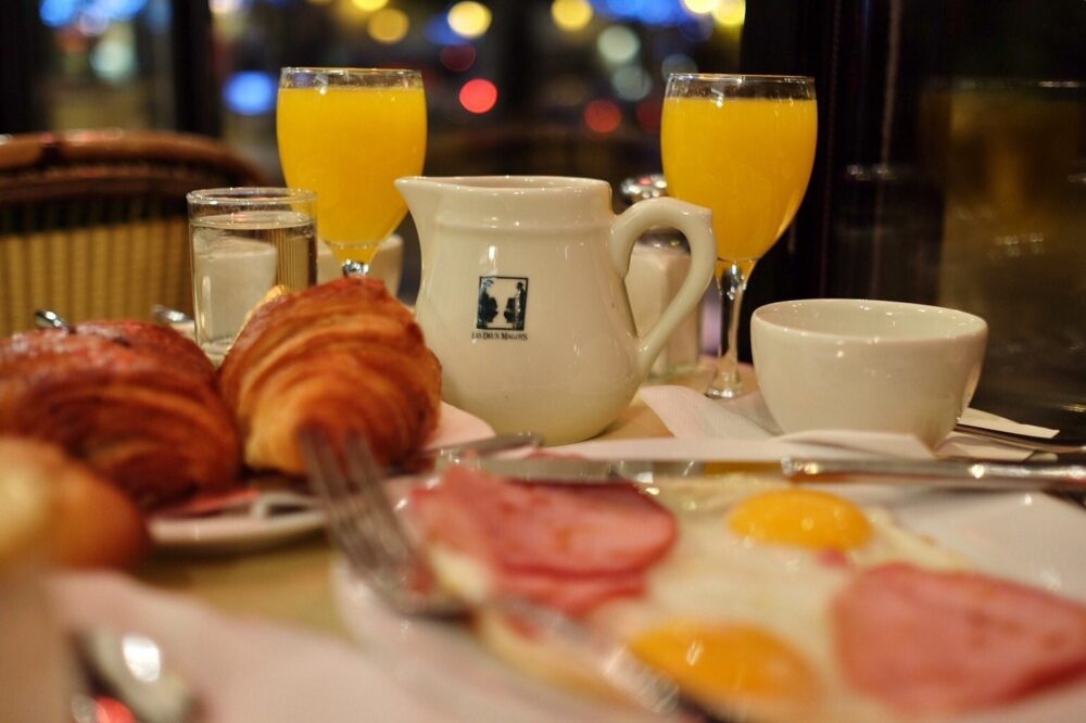 朝の時間帯には、クロワッサンやパン、ジャム、バター、カフェがセットになった朝食メニューも定番です。特別に凝った内容ではありませんが、老舗カフェのテラスでいただく朝食は、それだけで非日常感があります。