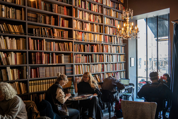本店の中庭に面した場所にあり、壁一面に積まれた洋書が印象的な落ち着いたカフェです。温かみのある木のインテリアが心地よく、忙しい旅の途中でもほっと一息つける空間が広がっています。