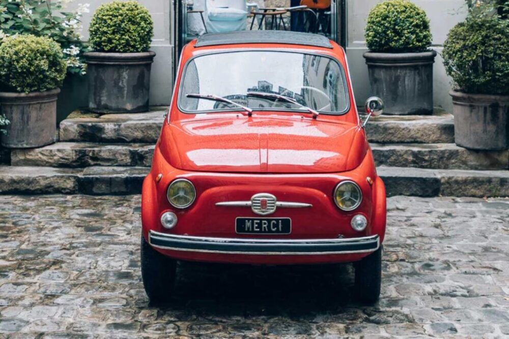本店はマレ地区にあり、入口の赤いクラシックカーが象徴的な存在。路地裏のような中庭に佇む外観は、パリらしいおしゃれさと温かみがあり、訪れる人の心を自然と弾ませます。