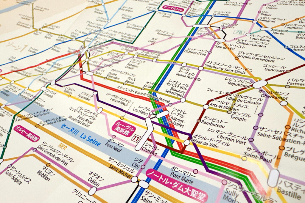 観光でパリをいろいろ回るときは、見やすい路線図を手に入れておきたいものです。メトロやRERは路線が複雑に入り組んでいるため、事前に用意しておくと移動がぐんとスムーズになります。
