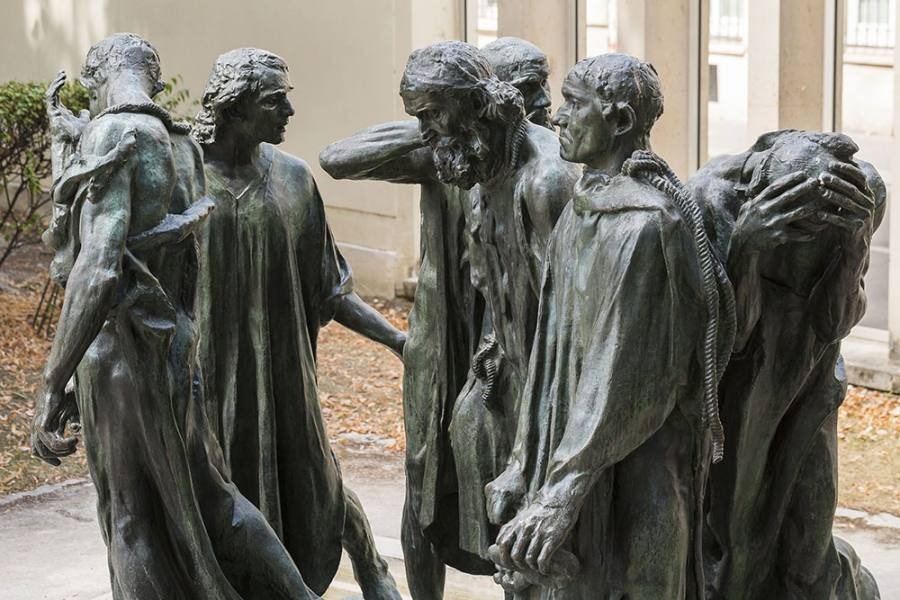百年戦争中にイギリス軍に包囲されたフランス北部カレー市で、自らを犠牲にして町を救おうとした6人の市民を描いた群像です。英雄として誇らしげに立つ姿ではなく、死の恐怖に直面し、それぞれが異なる苦悩を抱える「人間としての姿」をリアルに描き出しています。