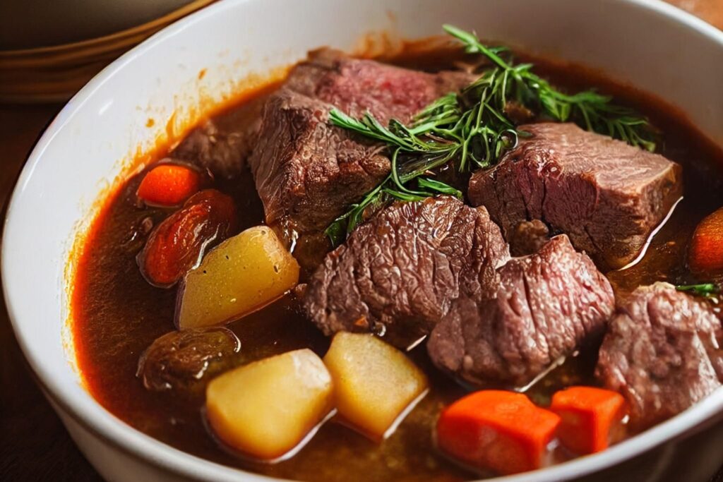 フランスの冬の定番料理で、赤ワインでじっくり煮込んだ牛肉と野菜が特徴です。お肉はほろほろに柔らかく、濃厚なソースがパンやマッシュポテトと相性抜群。